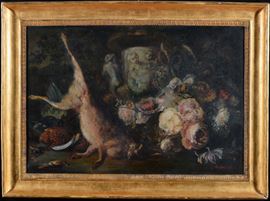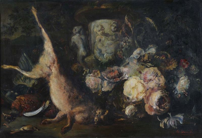 Autore Francese della fine del XVIII secolo Natura morta con fiori e coniglio