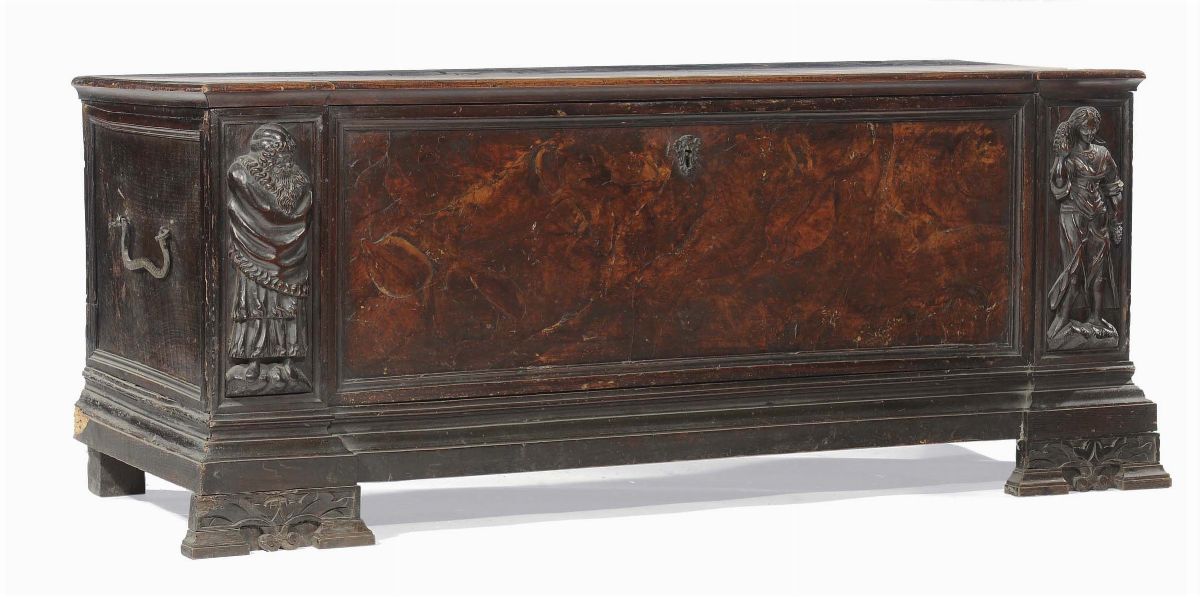 Cassapanca con cariatidi intagliate sui montanti, XVII secolo