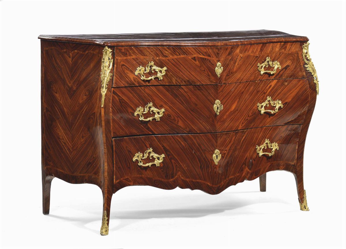 tre cassetti a specchio, fronte e fianchi mossi, maniglie e scarpette in bronzo dorato, cm 142x62x94