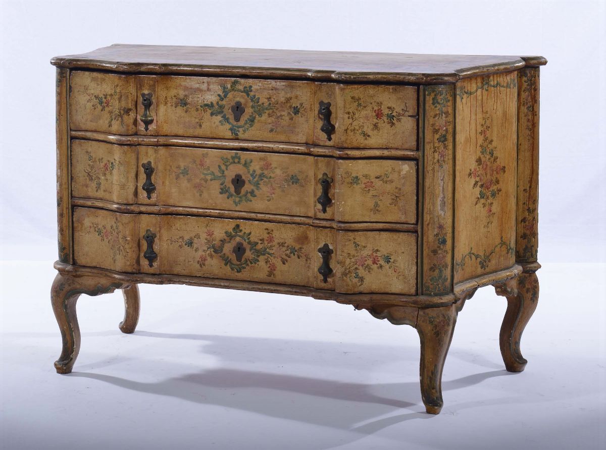 Comò in legno dipinto a motivi floreali in rosso e blu su fondo giallo, Veneto XVIII secolo