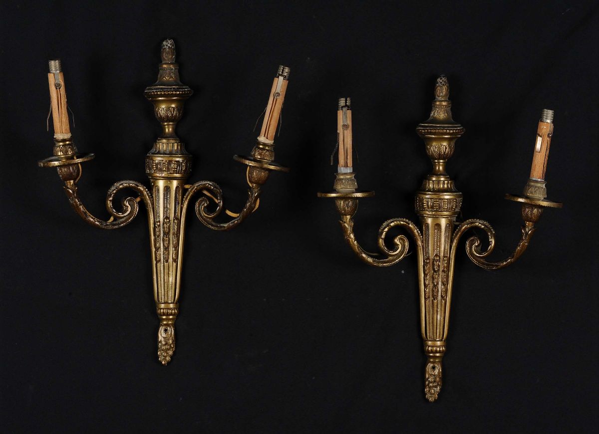 Coppia di appliques in bronzo dorato a due luci