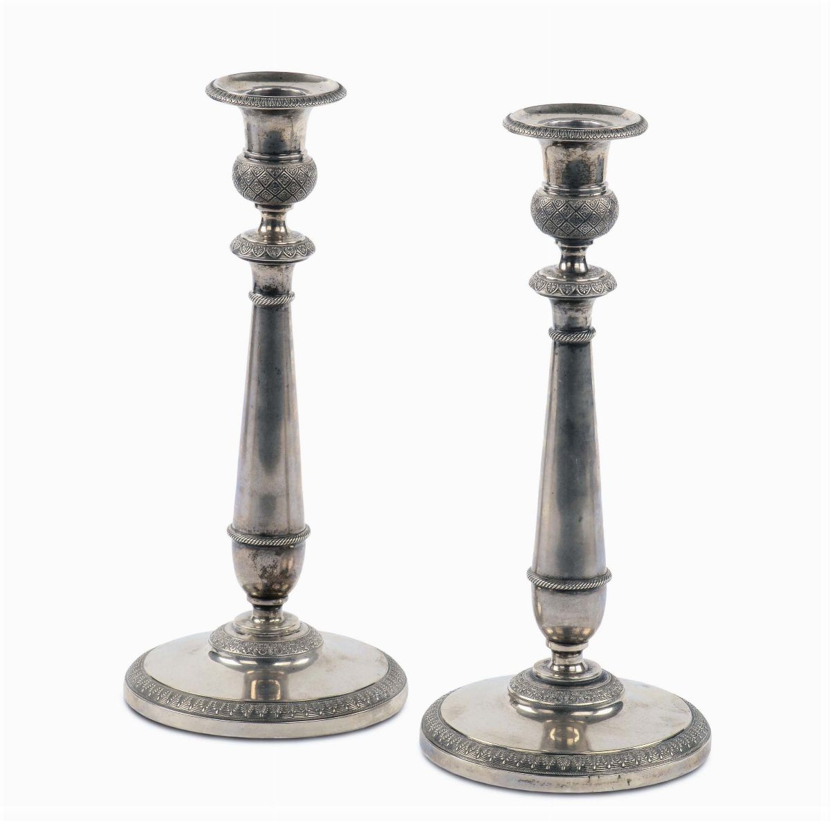 Coppia di candelieri in argento, bollo di Garanzia Novara