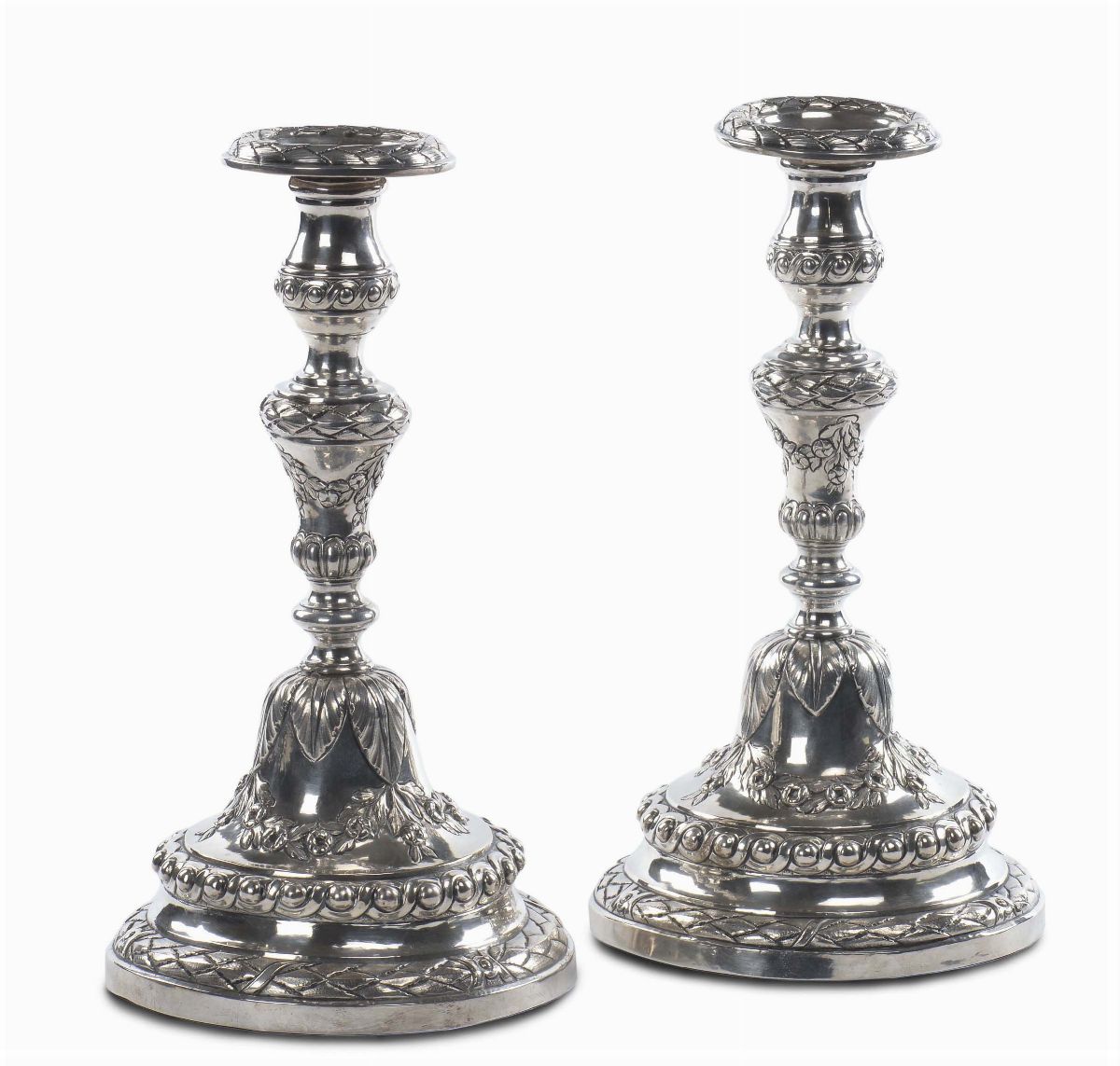 Coppia di candelieri Luigi XVI in argento, Genova 1784