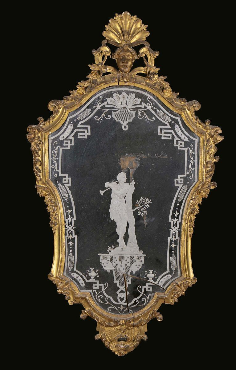decoro a motivo vegetale e volute, testine sulla sommità, cm 100x55 (rotture agli specchi)