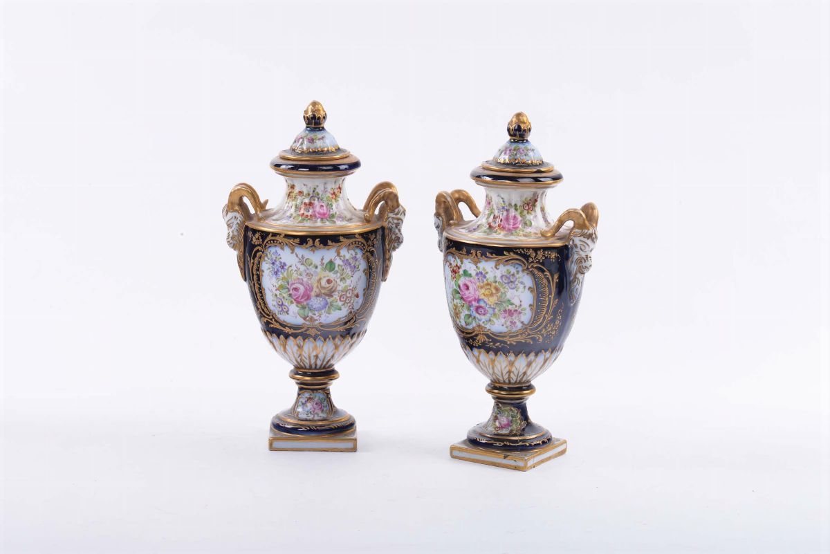 decoro policromo a motivo floreale a fondo blu, teste di ariete in rilievo, altezza cm 22 (difetti)