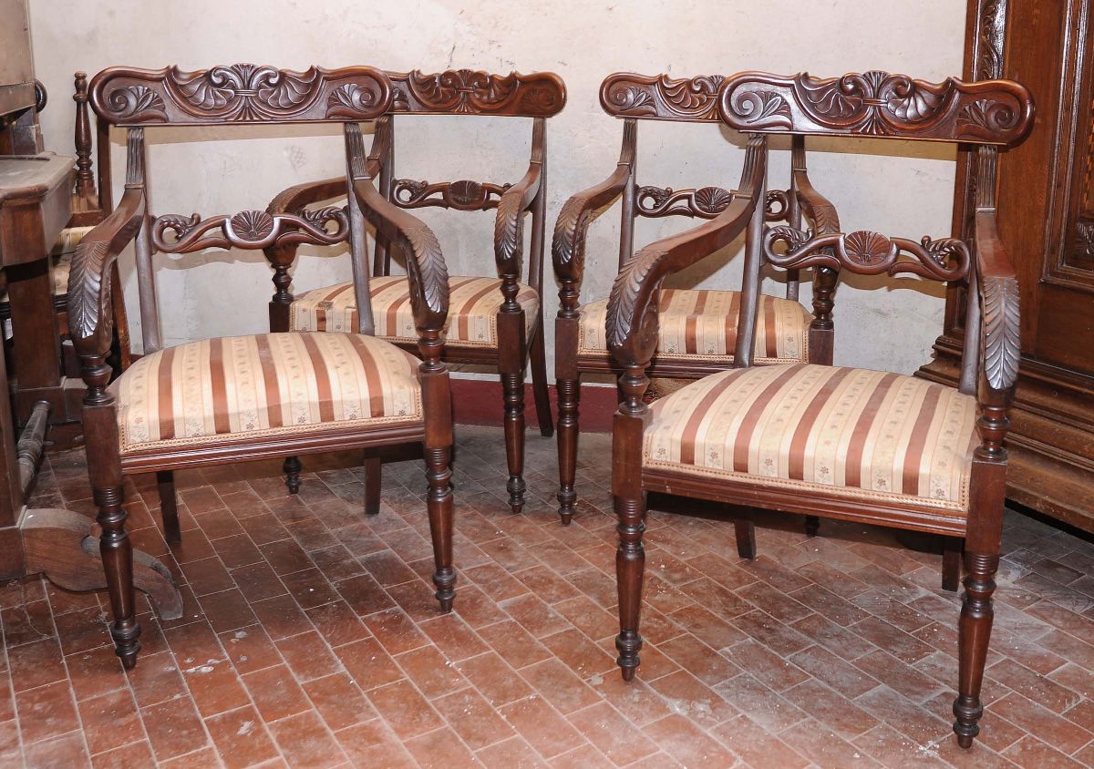 Divano e quattro poltrone in legno di mogano, XIX secolo