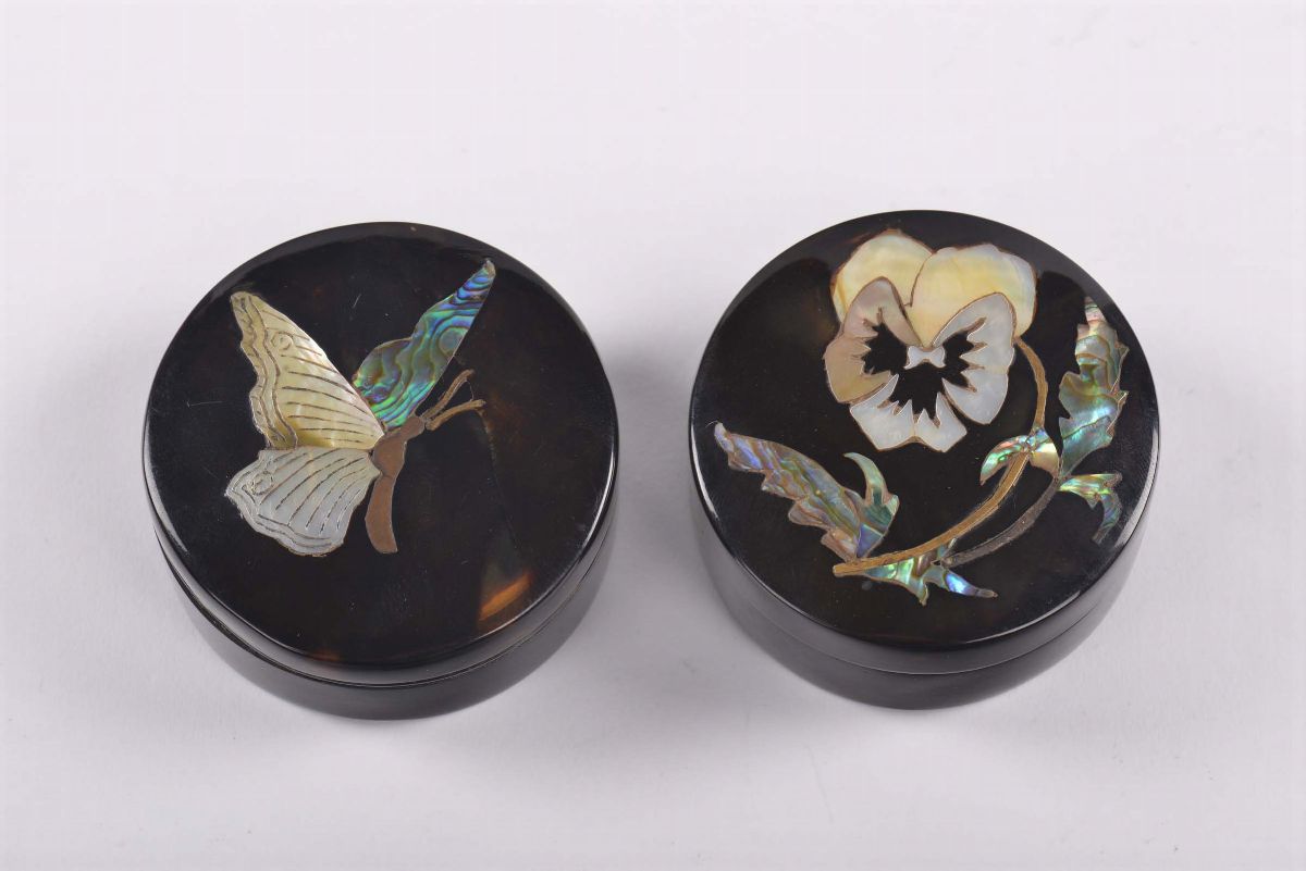 Due scatoline portapillole in tartaruga con inserti in madreperla