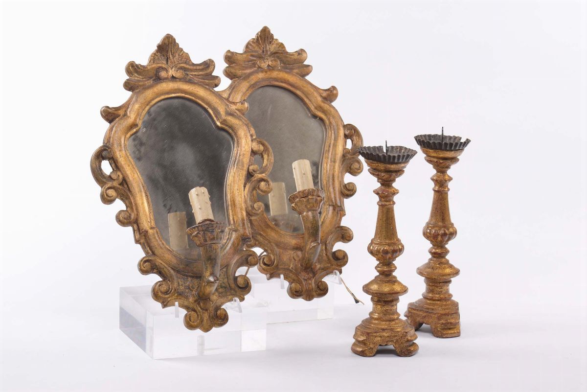 Due specchierine e due candelieri in legno dorato