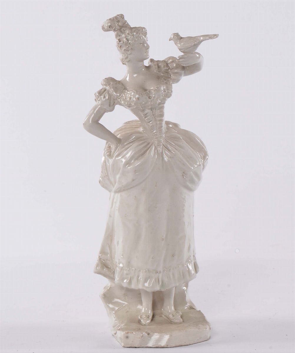Figura in ceramica bianca raffigurante dama con uccellino, Veneto fine XVIII secolo