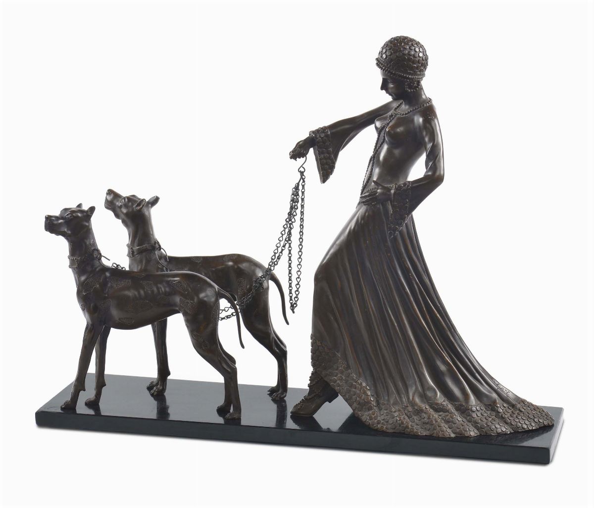 Gruppo in bronzo composto da donna con due levrieri su base in marmo firmata Ginori