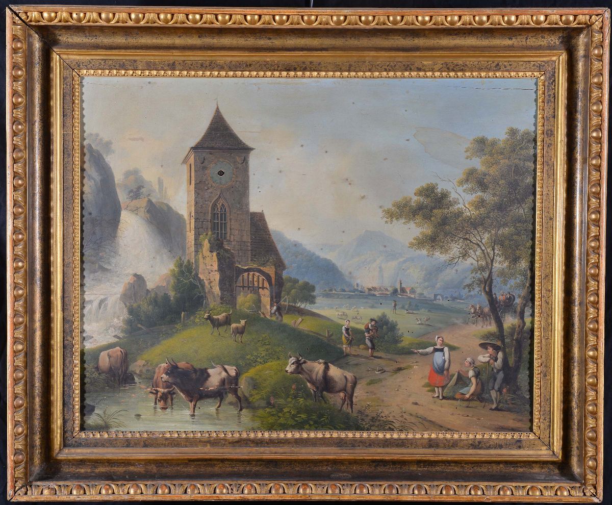 olio su tavola raffigurante paesaggio, cm 70x85 (mancante di orologio)