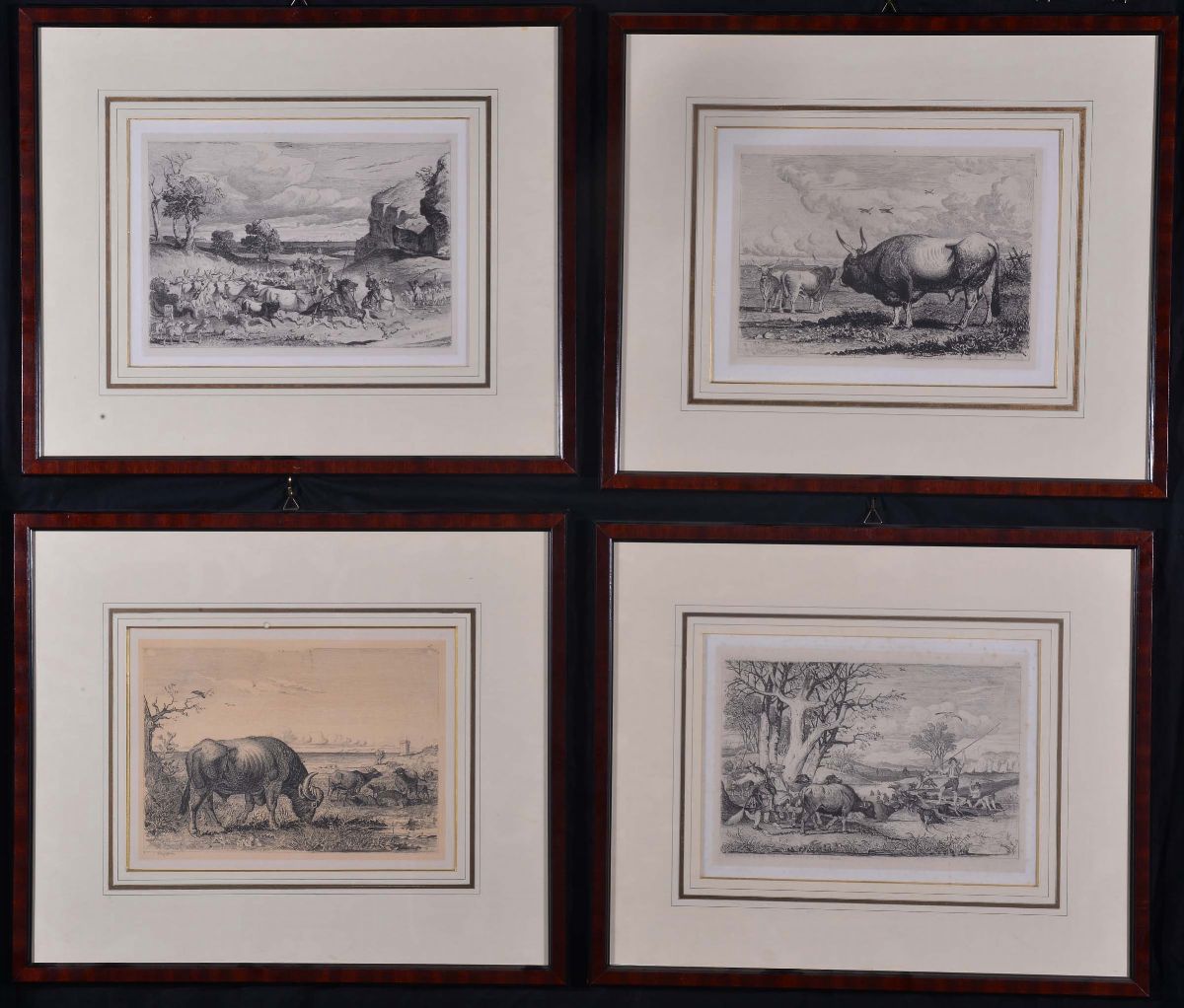 Quattro stampe in cornice raffiguranti animeli e scene di caccia
