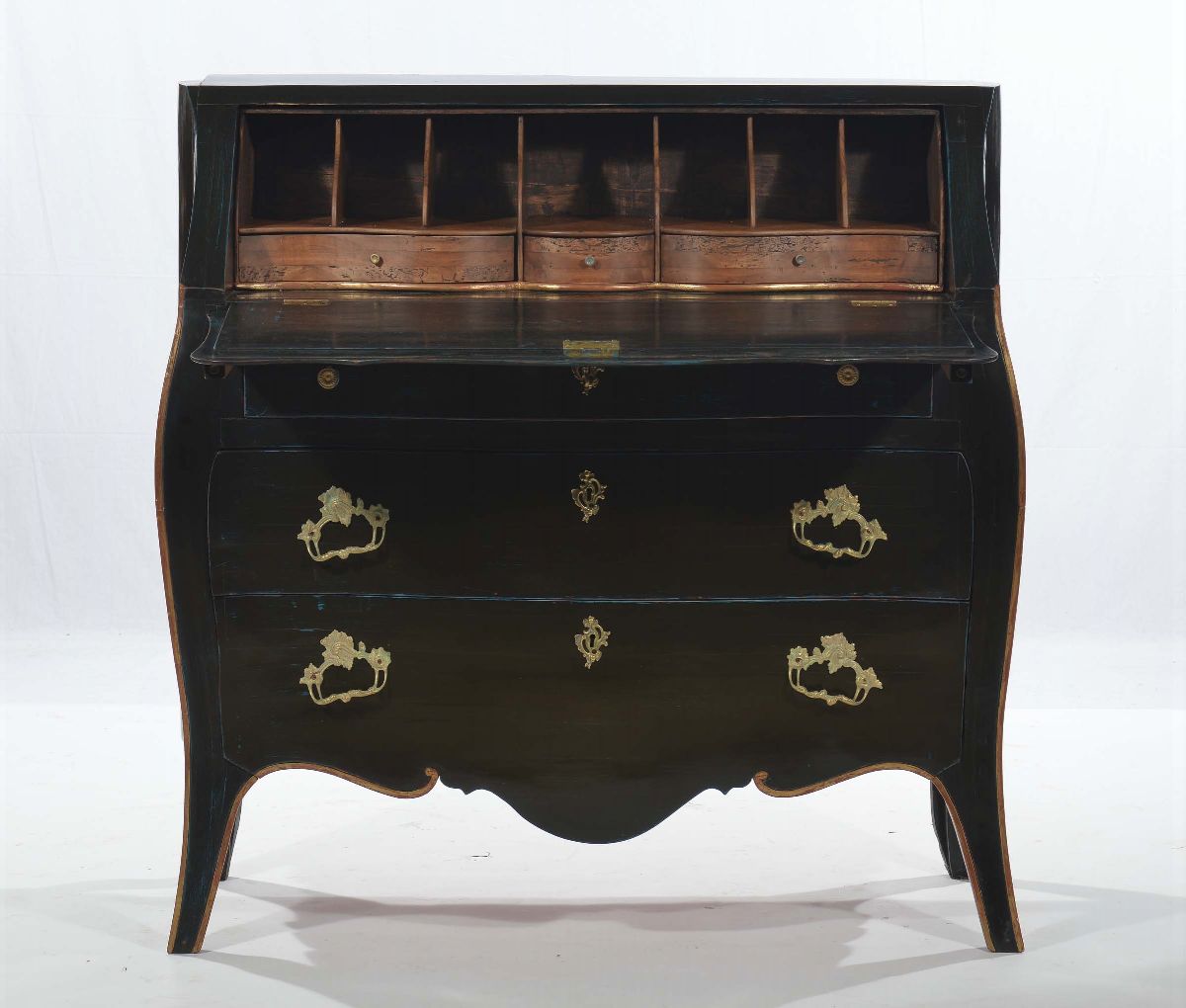 fronte mosso a tre cassetti , calatoia che cela cassettini e vani a giorno, alette sui montanti, cm 117x58x118