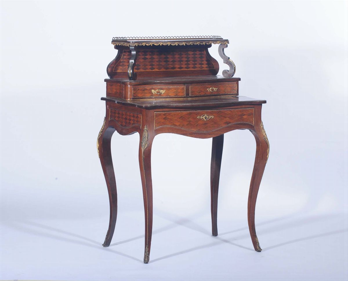 un cassetto sulla fascia, alzata con due cassettini affiancati alla base e vano a giorno centrale, applicazioni di bronzi dorati, gambe arcuate, cm 71x51x106
