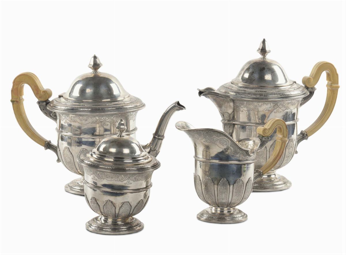 composto da teiera, caffettiera, lattiera e zuccheriera con decoro da modello russo