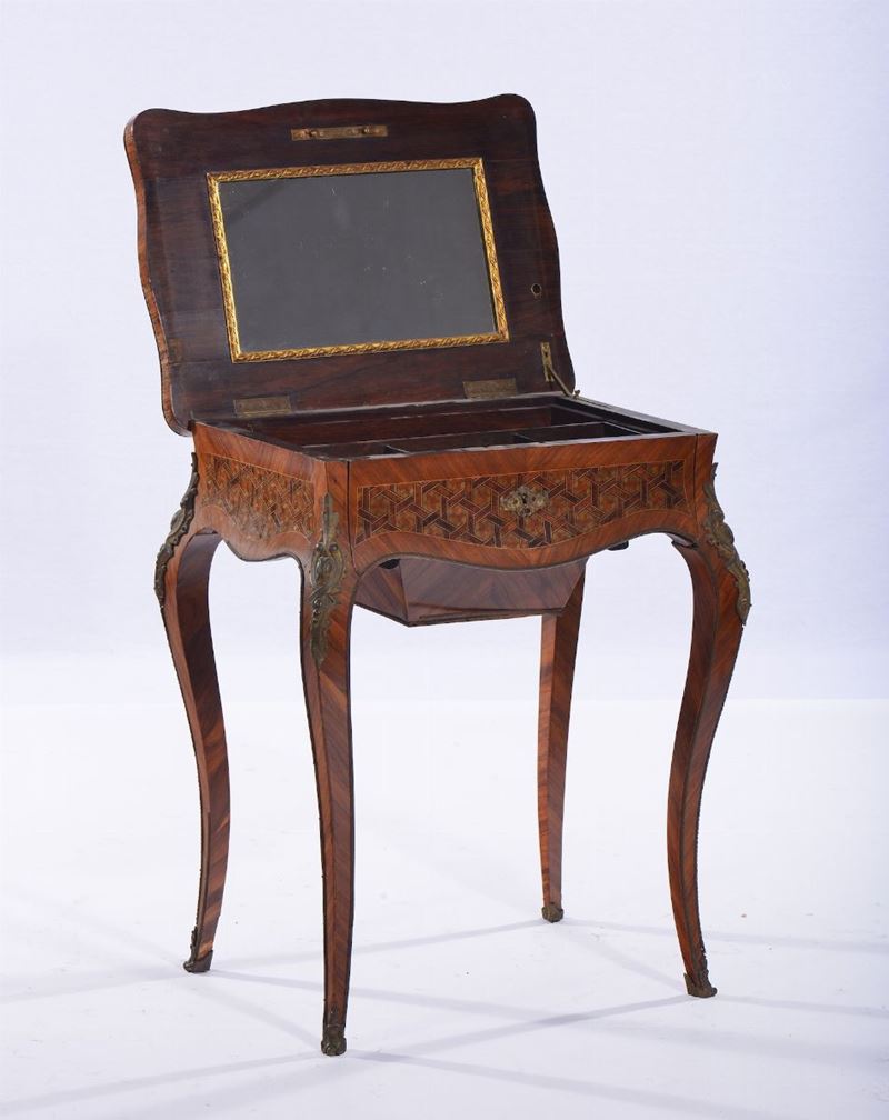 Tavolino da lavoro lastronato ed intarsiato, XIX secolo