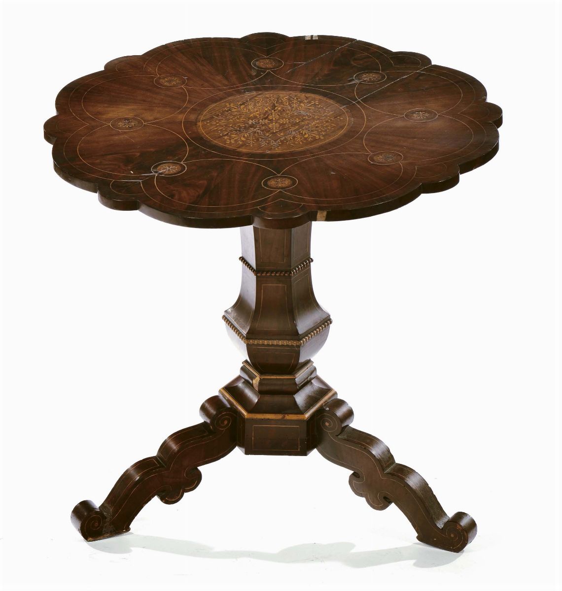 piano sagomato con intarsio e filettatura in legno chiaro, diametro cm 81, altezza cm 77