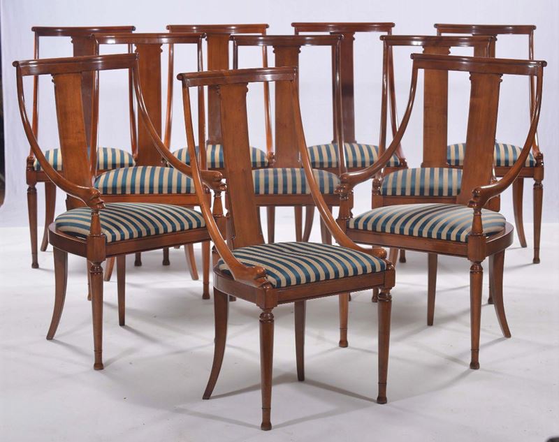 Tavolo con otto sedie e due poltrone in stile