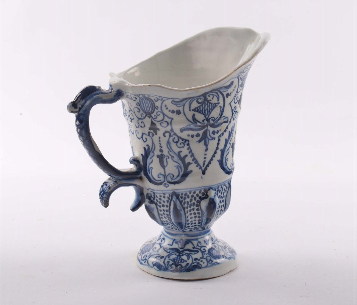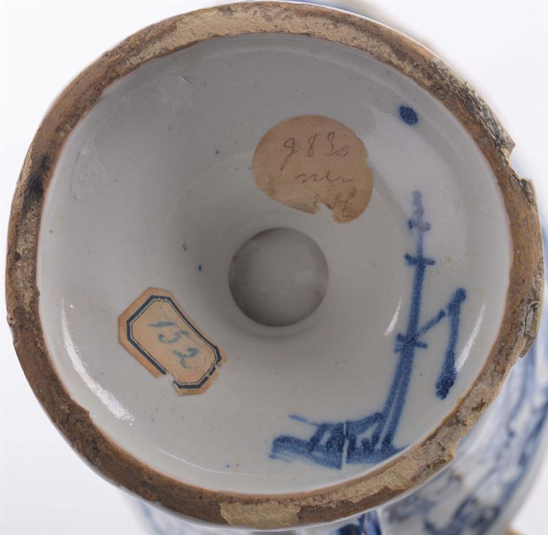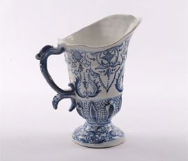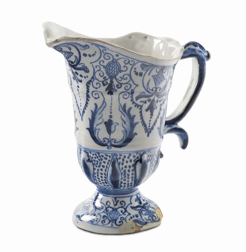 Versatoio in maiolica ad elmo con decoro alla berain, marca Lanterna, Savona XVIII secolo