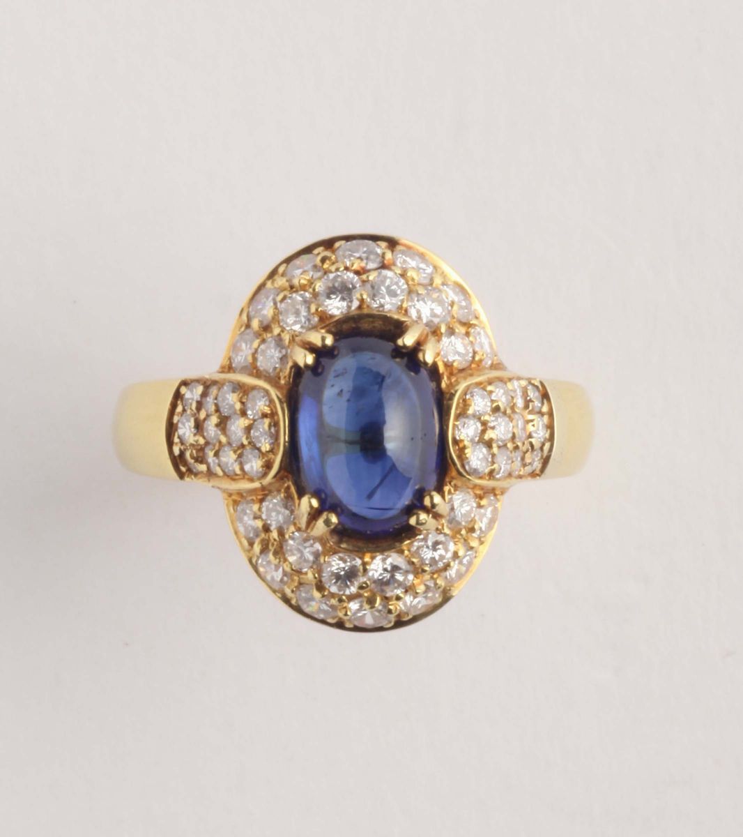 Anello con zaffiro cabochon di ct 2,35 e diamanti per ct 1,00 circa