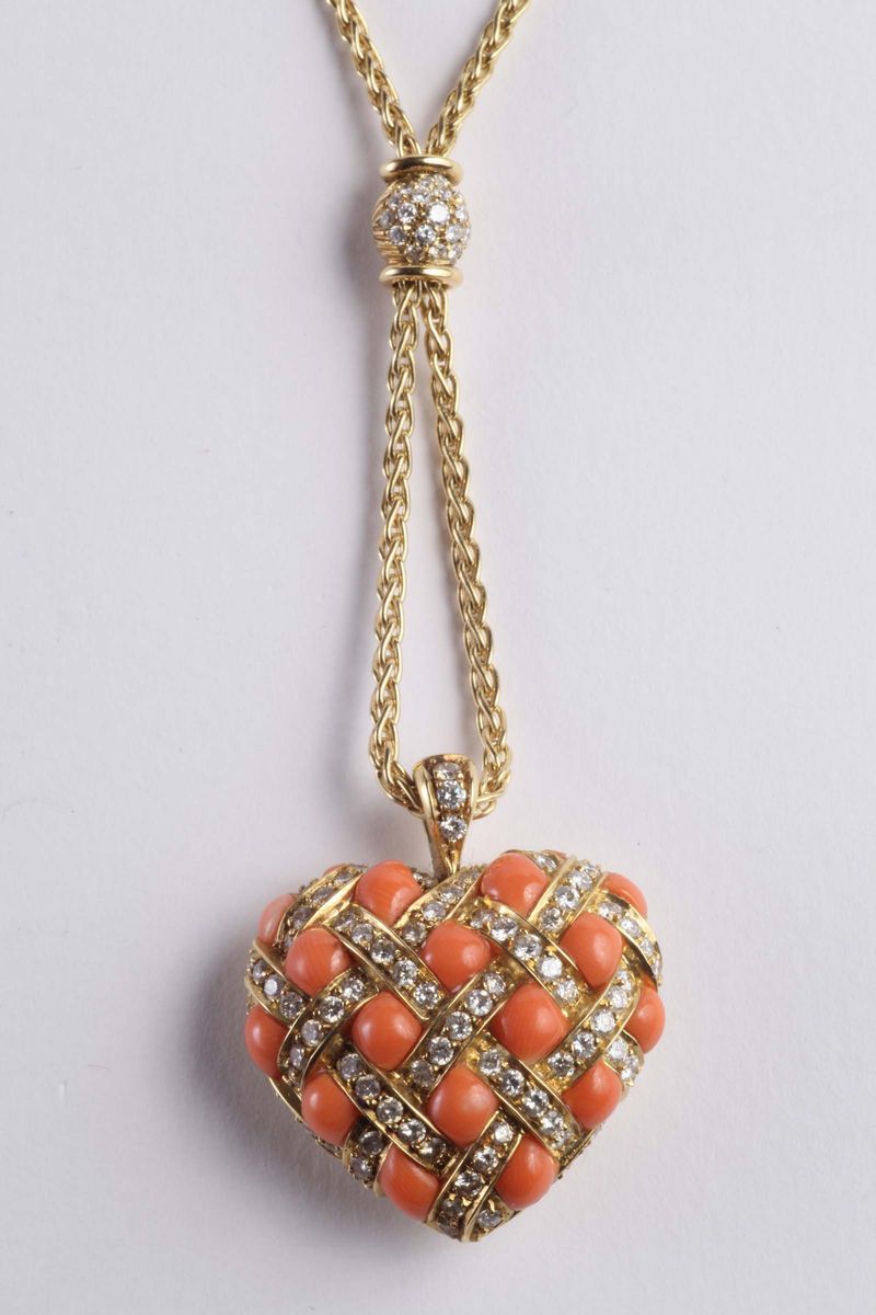 cuore in corallo rosa e diamanti. Oro giallo 18Kt
