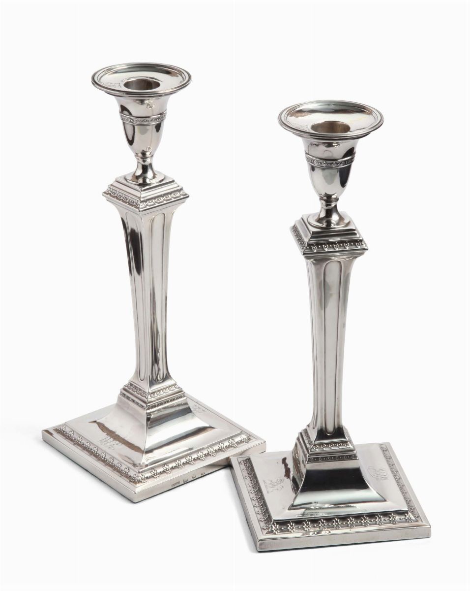 Coppia di candelabri in argento fuso e cesellato, con crest alla base e suelle bobeches. Giorgio III, città di Sheffield, 1783, argentiere H. Greenaway Collezione Bulgari