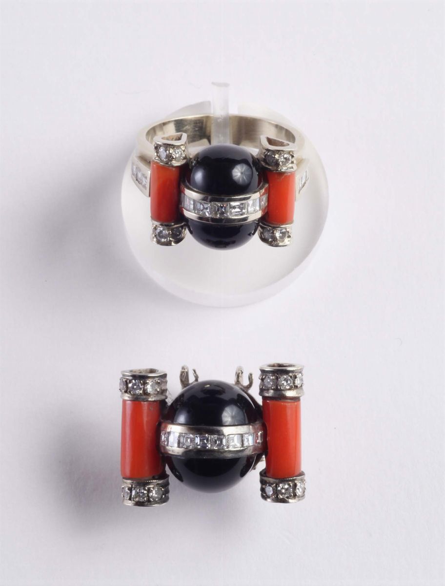 Lotto composto da anello e ferma foulard con corallo, onice e diamanti