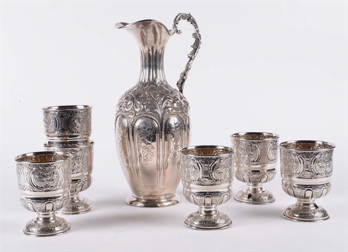 Lotto composto da brocca e sei bicchieri in argento