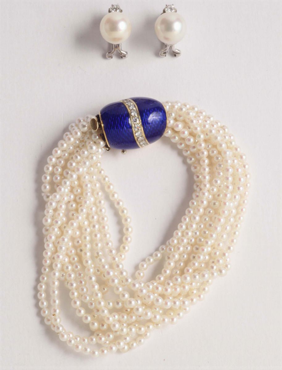 Lotto composto da un braccialetto di perle con chiusura in smalto e diamanti e paio di orecchini con perle diamanti