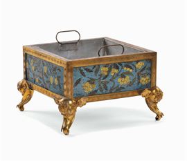 Centrotavola in bronzo dorato e smalti cloisonnè con decoro floreale su fondo azzurro, Cina, Dinastia Qing, XIX secolo