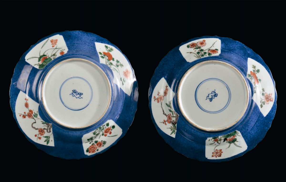 Coppia di piatti in porcellana blu poudre e oro, a riserve Famiglia Verde, Dinastia Qing, periodo Kangxi (1662-1772)