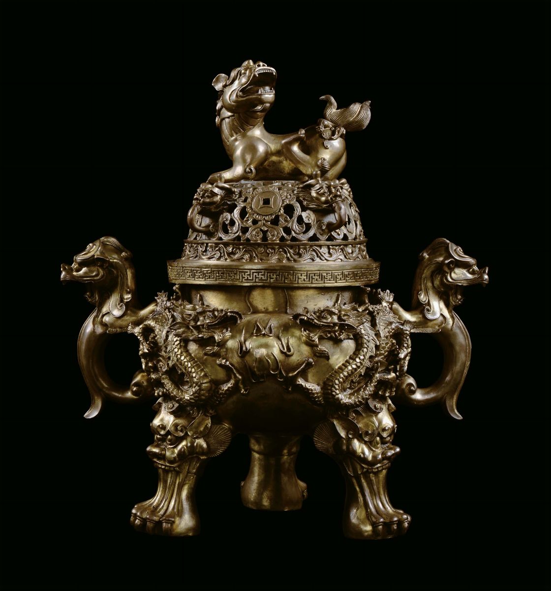 decorato a rilievo con dragoni, leoni e cani di Pho, cm 44x25x48