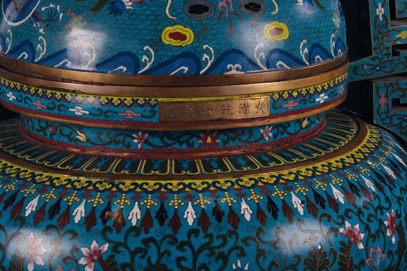 corpo ovoidale poggiante su tre piedi con teste di elefanti, grande anse a greca, decorazione a motivi vegetali stilizzati su fondo azzurro, cane di Pho in bronzo dorato sul coperchio, marchio Qianlong apocrifo a sei caratteri, cm 73x65x100