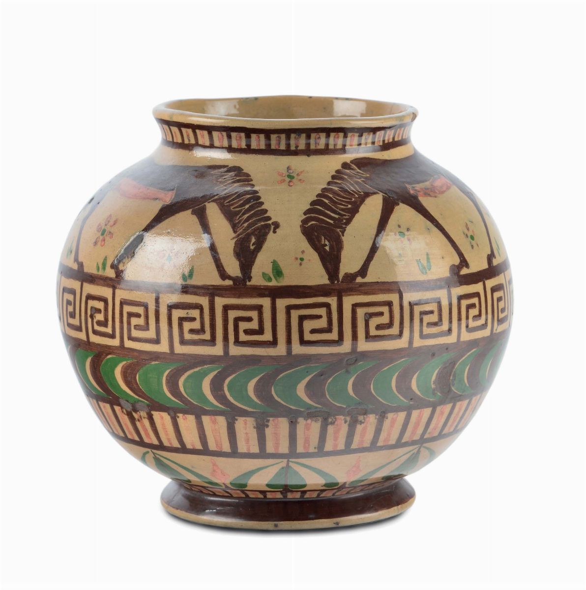 Terracotta dipinta a mano con disegni geometrici , cavalli e figure mitiche. Sotto la base: B. Cicerchia, V. Cavalieri, Roma, 1924. Altezza cm 22