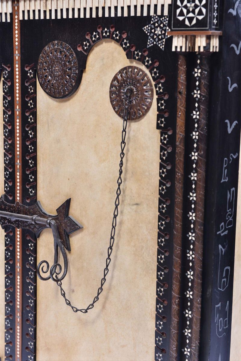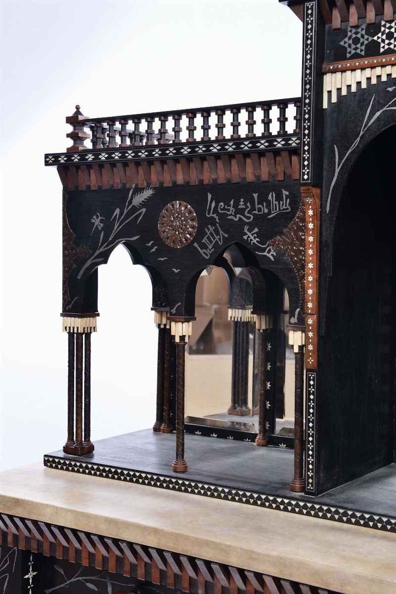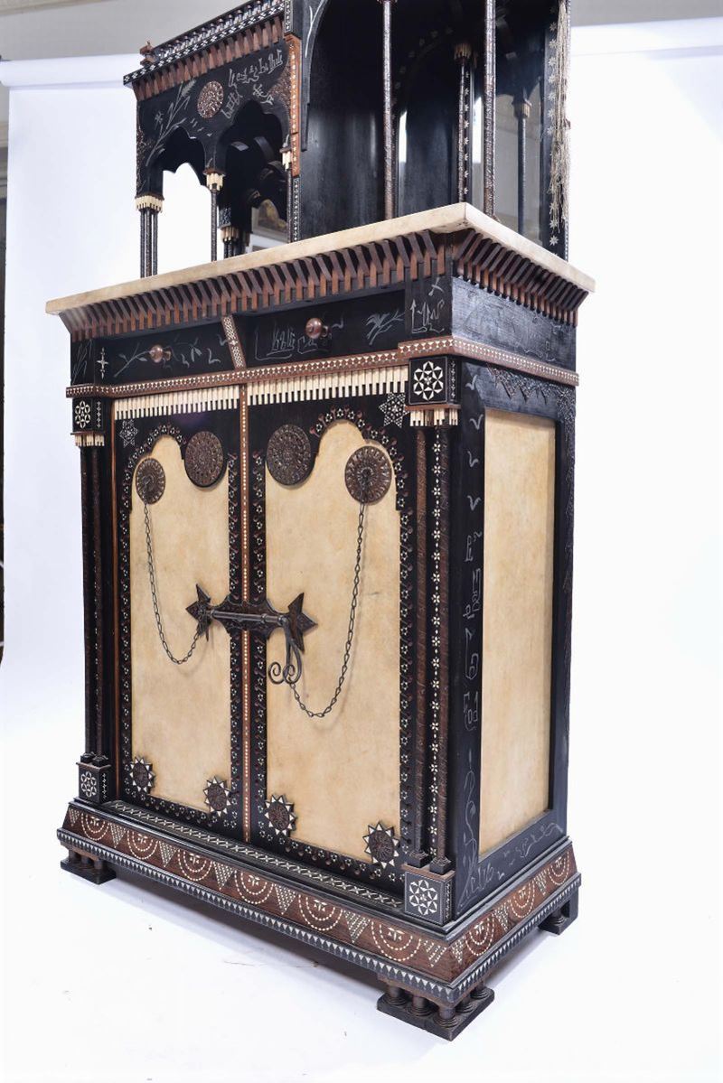 Mobile a due corpi. Legno di noce, noce ebanizzato, rame sbalzato, intarsi di metallo e di osso, intarsi in madreperla, pergamena, seta. 1900 ca. Parte inferiore cm 110x100x48 - parte superiore cm 80x95x33