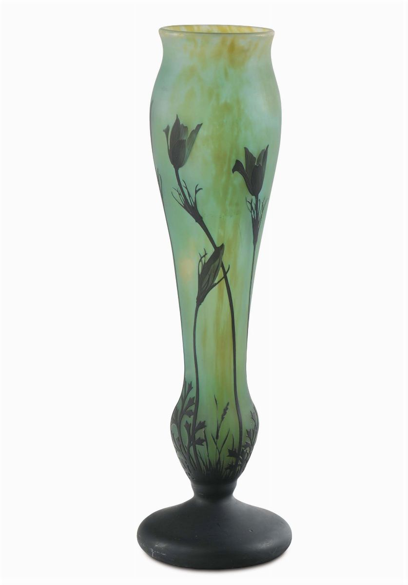 vetro incolore con inclusione di polveri vitree gialla e verde, doppiato in marrone scuro e inciso all'acido con decoro floreale. Firmato Daum Nancy e croce di Lorena. Altezza cm 54