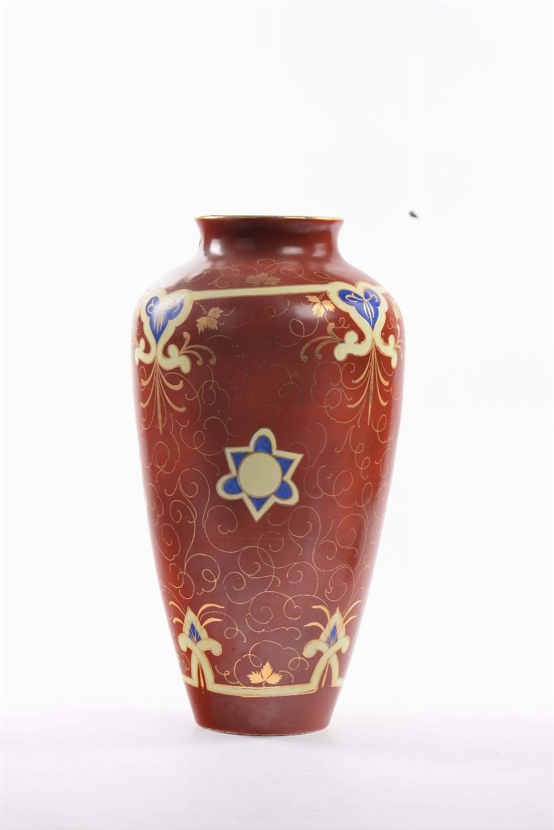 porcellana verniciata color mattone e decorata in bianco, blu e ocra. Sotto la base FQF Como. Altezza cm 37