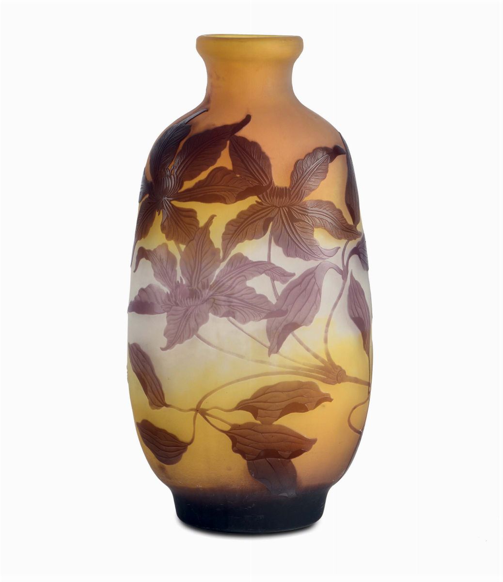 vetro incolore con inclusione di polveri gialle, doppiato in vetro viola, lavorato all'acido e alla mola con decoro di fiori. Firma a cammeo, 1900 circa. Altezza cm 41