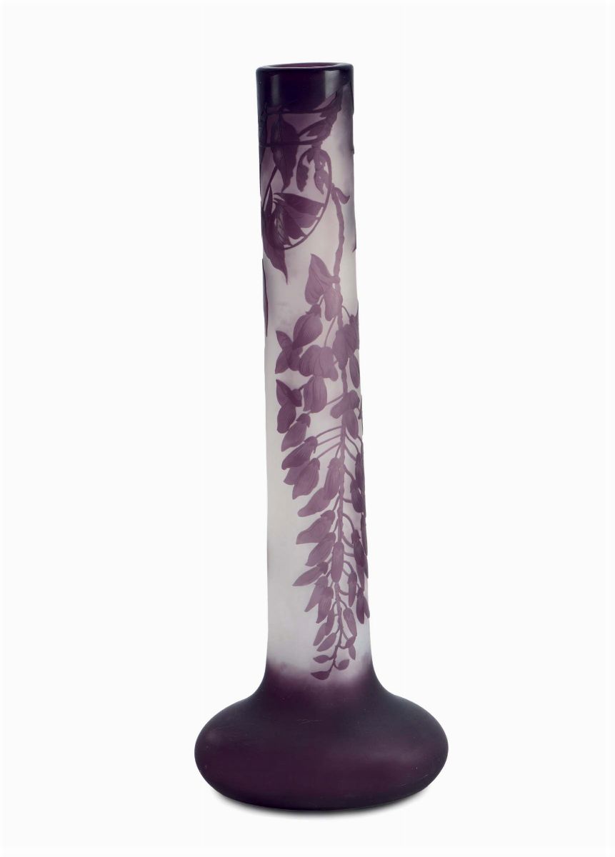 vetro incolore con inclusione di polvere viola e doppiato in vetro viola, inciso all'acido e lavorato a cammeo con decoro di glicine. Firma a cammeo preceduta da stella posteriore al 1904. Altezza cm 44