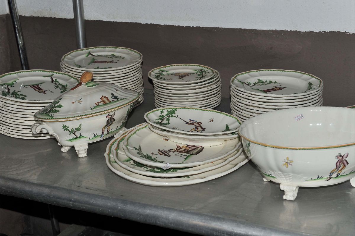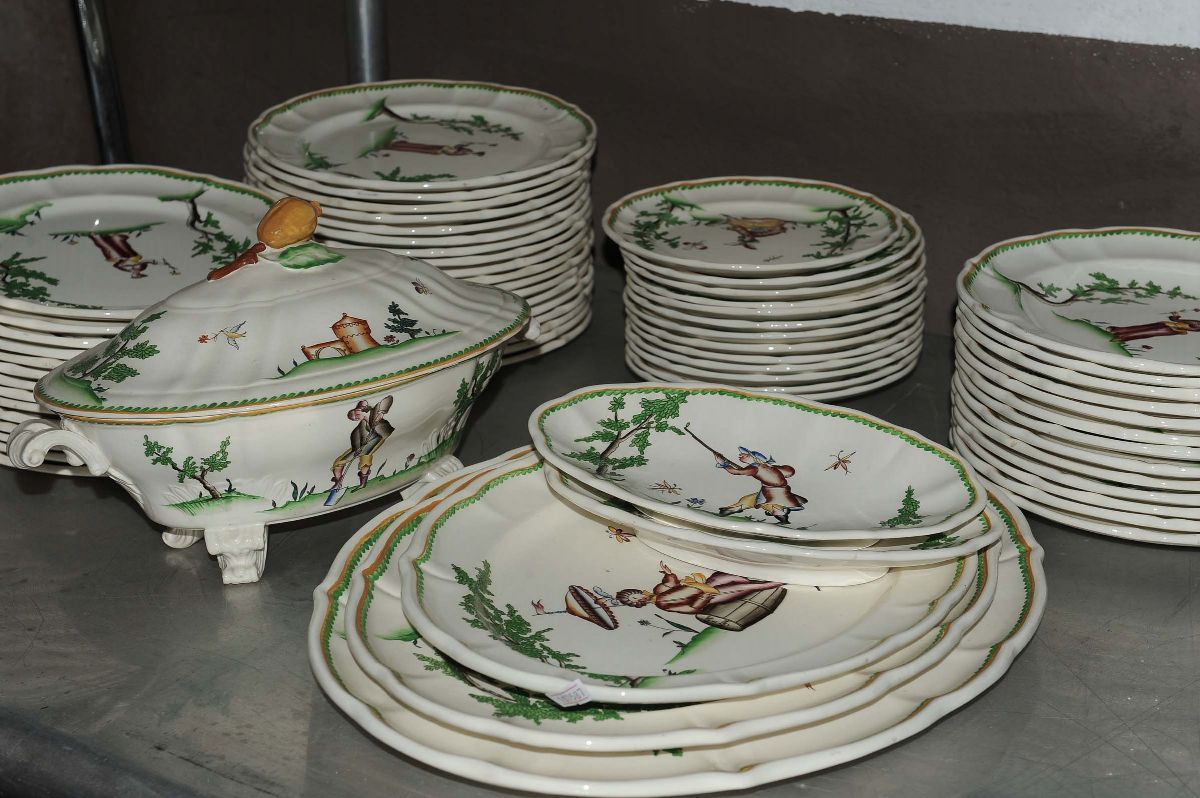 composto da 32 piatti piani, 13 piatti fondi, 13 piattini, 5 piatti da portata, 2 zuppiere, una insalatiera, 2 piatti ovali, una salsiera con difetti. Sotto le basi marchio della manifattura a stampo ed entro cartiglio a forma di cuore: Figure Vecchio Milano Laveno