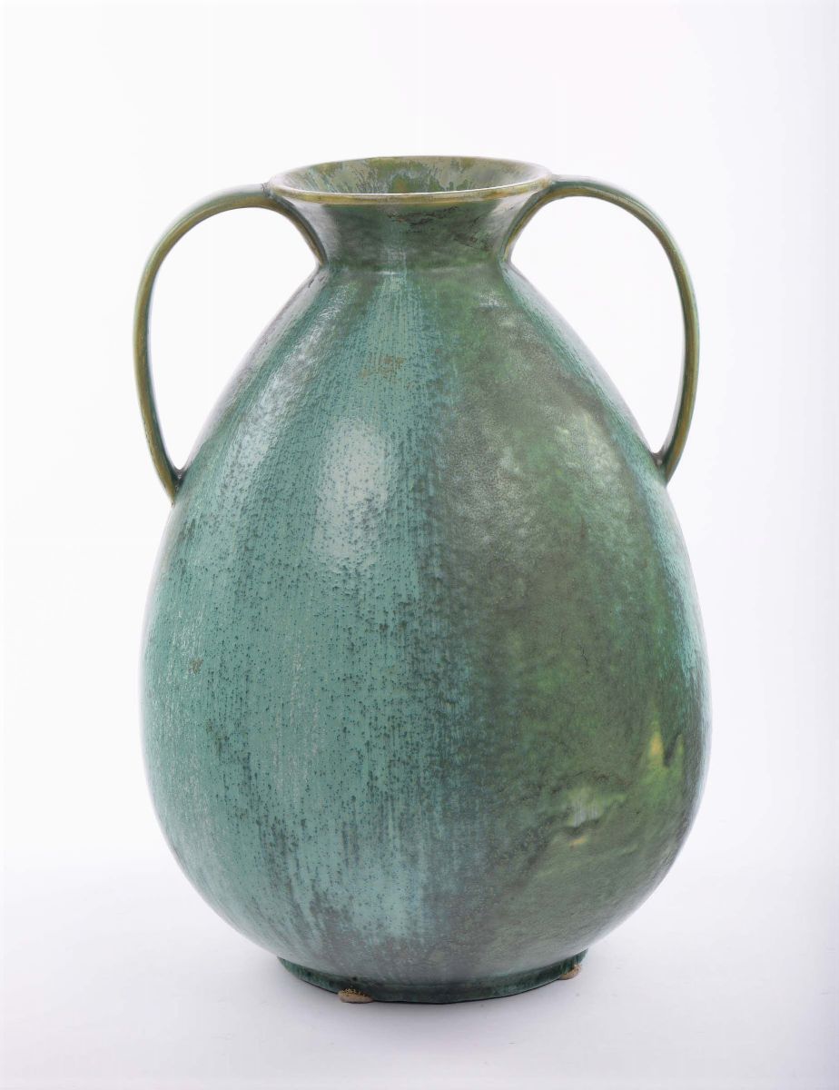 ceramica smaltata a colaggio verde iridescente con colature. Marchio della manifattura sotto la base.1938 circa, cm 42,5x34