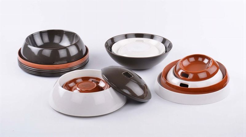 servizio da tavola composto da 18 pezzi. Vetroporcellana bianco, marrone e arancio. Marchio sotto la base. 1971 circa
