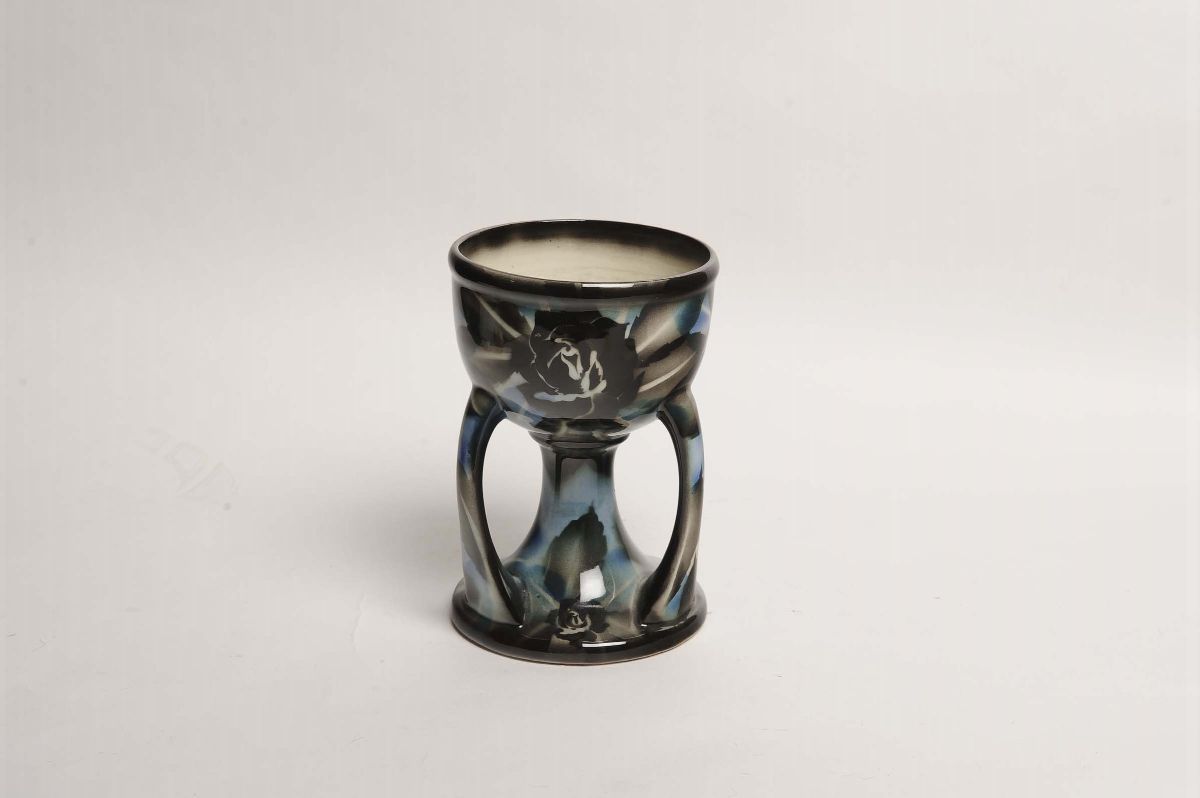 in ceramica poggiante su base circolare da cui partono tre prese; decorata all'aerografo nei toni del grigio, blu, bianco e nero con motivo di rose stilizzate. Altezza cm 17