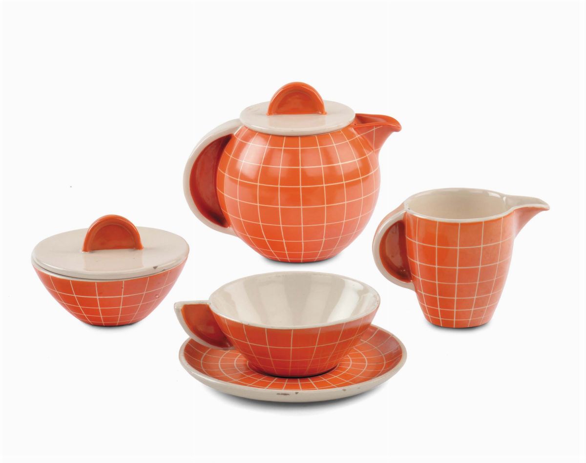 ceramica bianco e arancio con decoro a quadri. 1930 circa, altezza cm 14