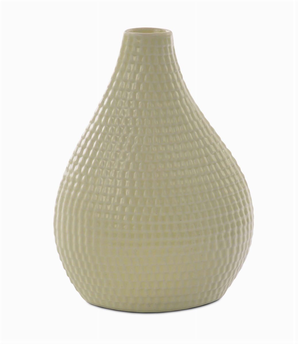 ceramica smaltata color giallo con decoro a rilievo. Traccia di marchio sotto la base. 1960 circa, altezza cm 18,4