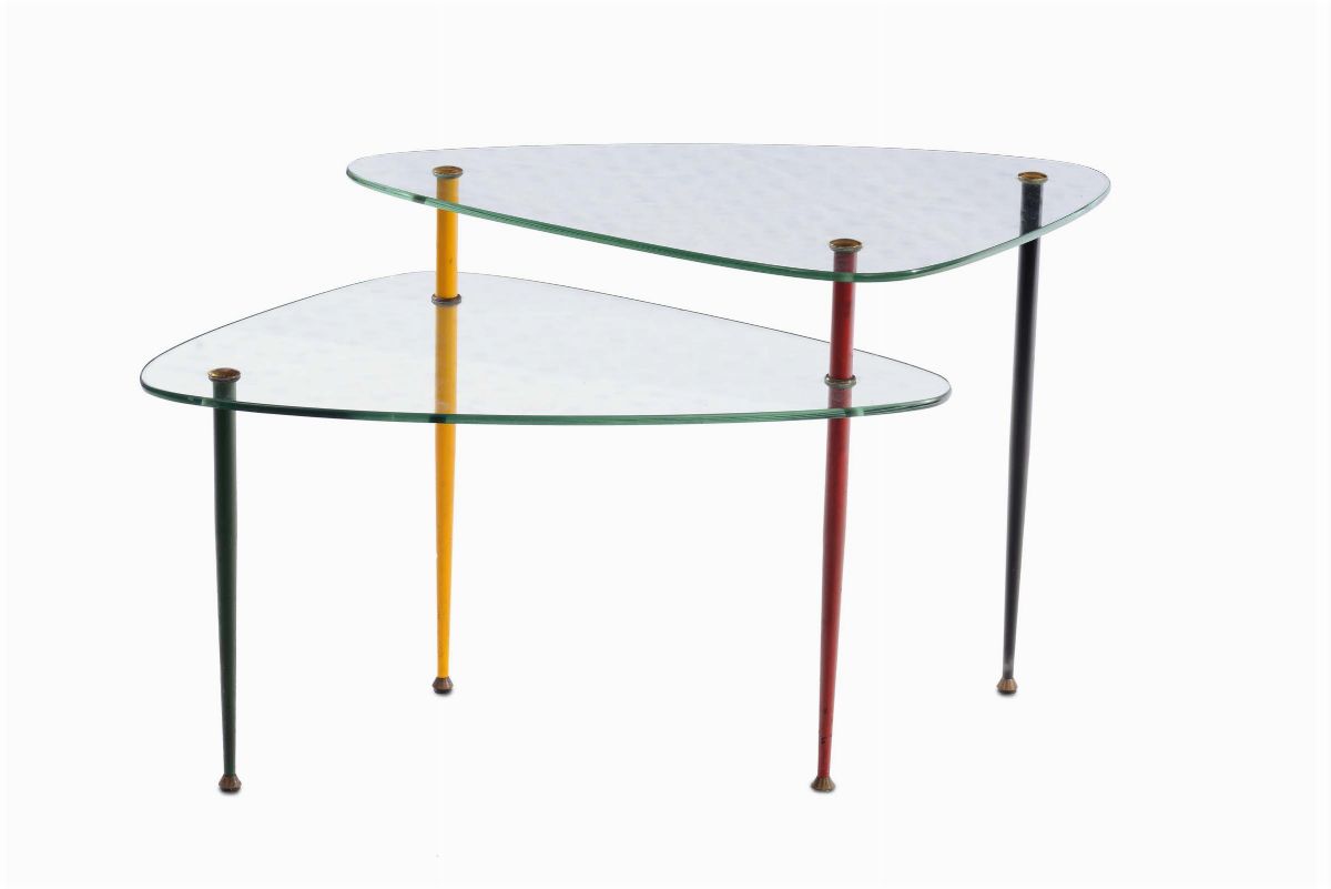 tavolino mod. “Arlecchino” gambe in metallo laccato nei colori primari più il nero, due ripiani in vetro temperato, puntali e ghiere in ottone, cm 55x52x70.Prod. Vitrex, Italia, 1950 ca.