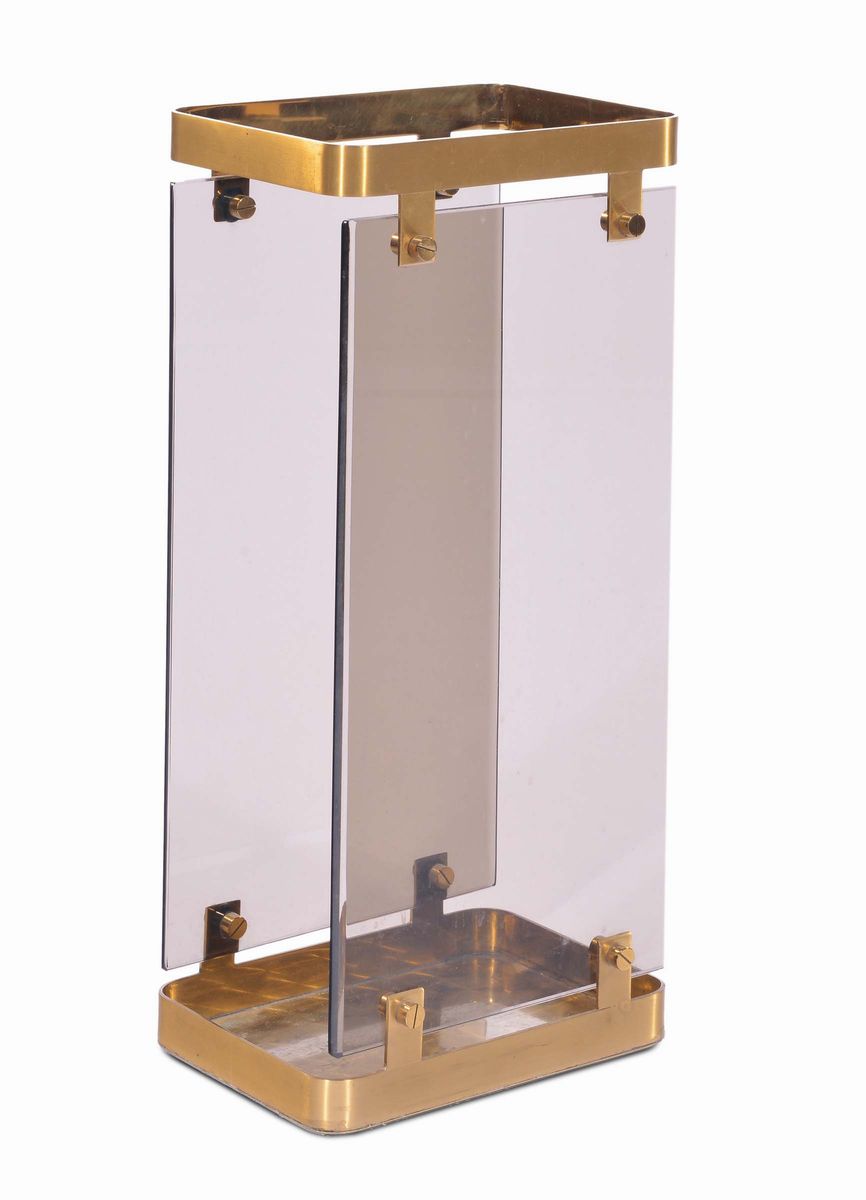 portaombrelli realizzato Fontana Arte su disegno di Max Ingrand, ottone lucido e vetro.Corpi in cristalli colorati grigio, ottone.Italia 1960 ca., cm 26x18x57