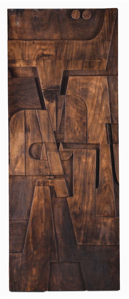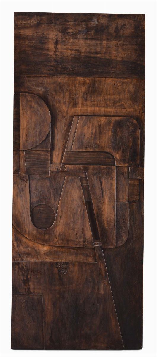 grande ed importante scultura in legno pirografato e lavorato a mano, cm 350x298.Esemplare unico realizzato da Nerone e Patuzzi nel 1974, firmato sul fronte Gruppo NP2 Torino Nerone 1974.