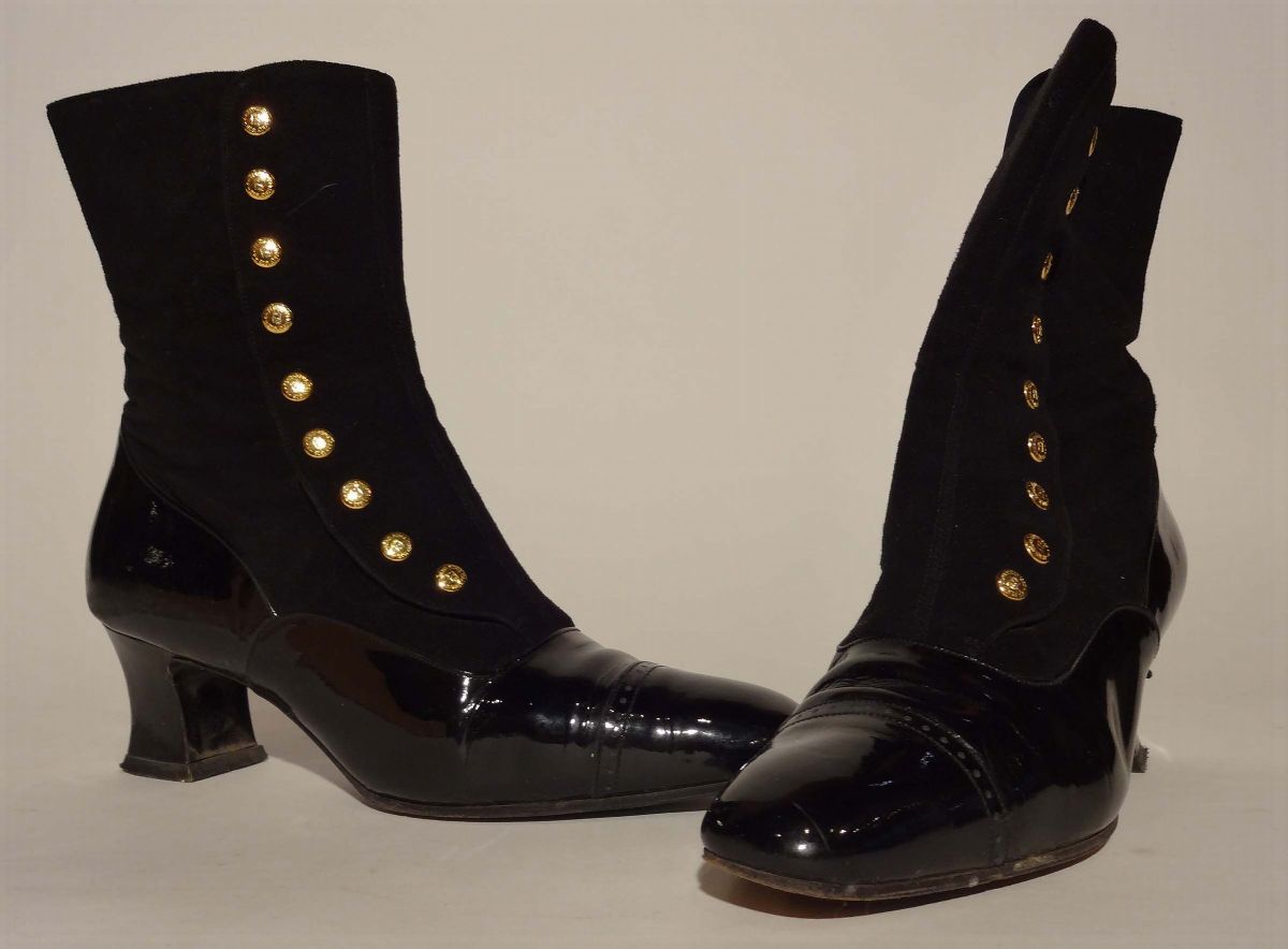 in camoscio e vernice nera con bottoni oro, misura 36