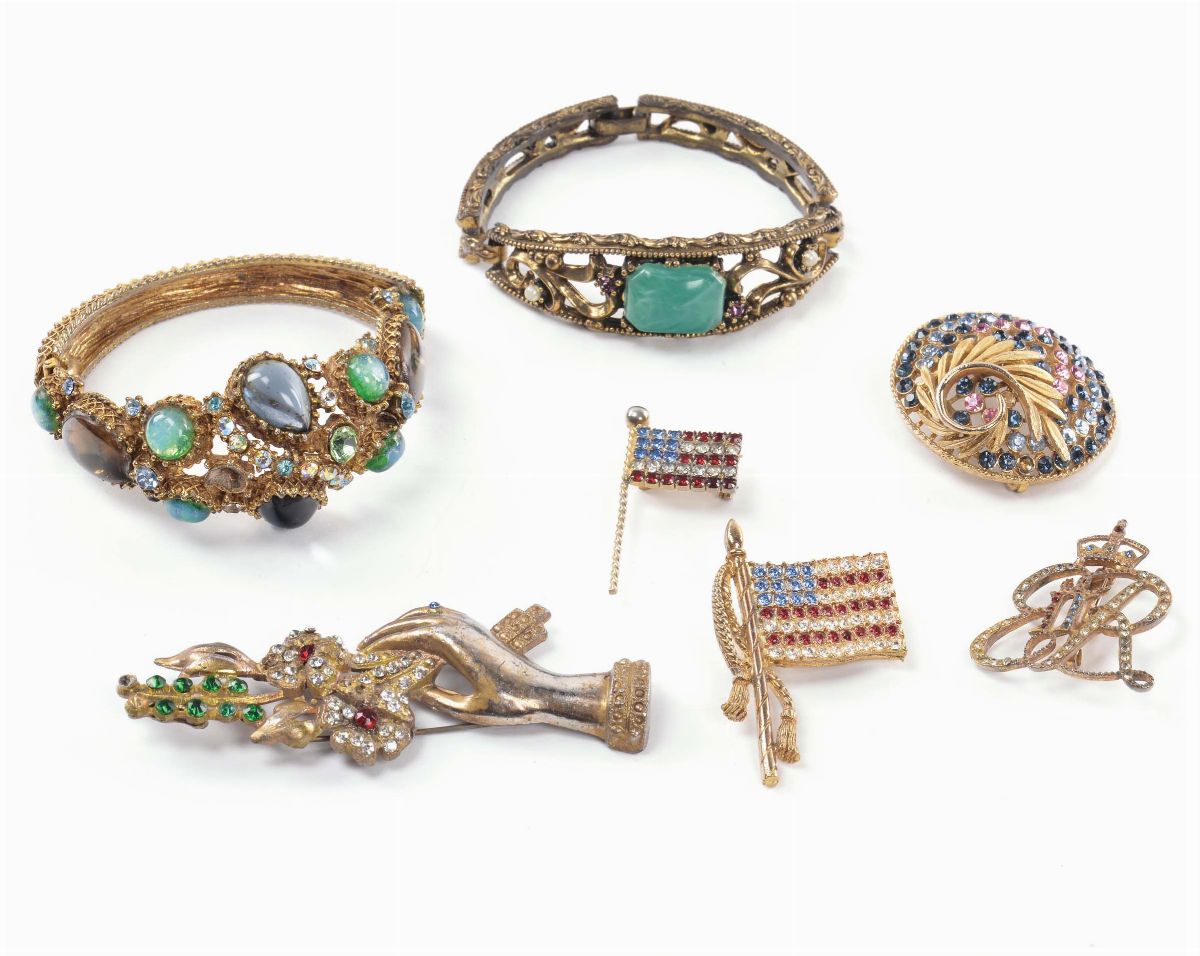 di cinque spille e due bracciali in metallo bronzato, strass multicolor e paste vitree. Una spilla è firmata “Hyg”